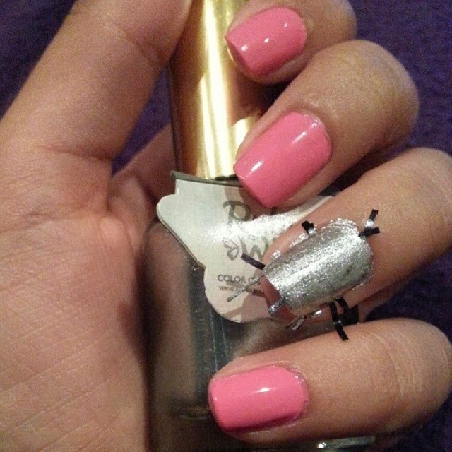 I used striping tape in a random pattern. Once the pink polish was completely dry, I made a pattern, then painted over the tape with the silver. I let the silver dry partially, and then slowly peeled the tape off.